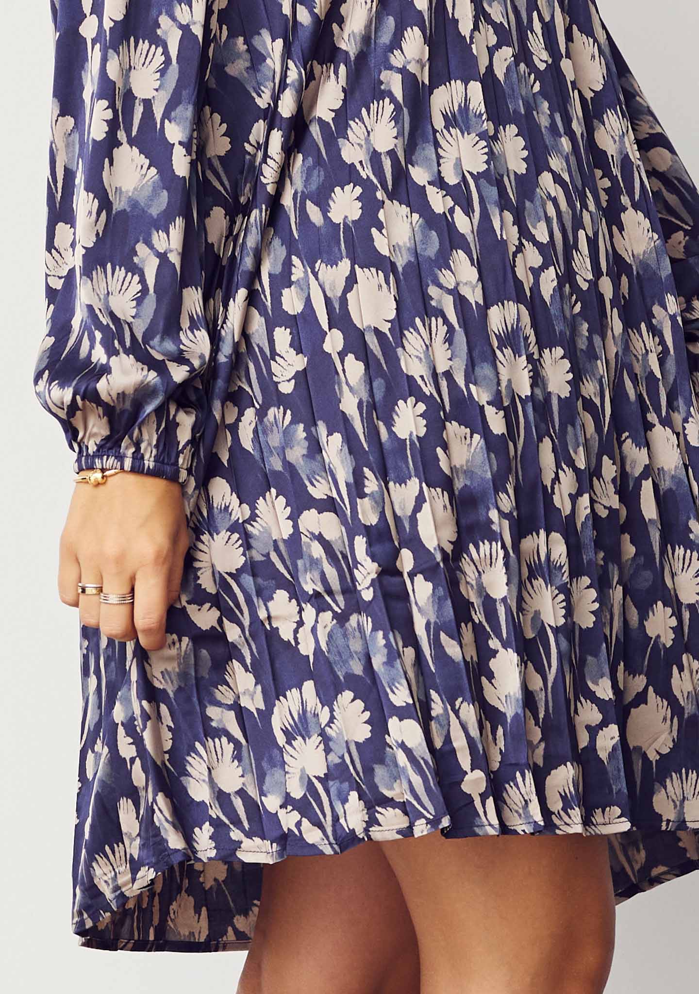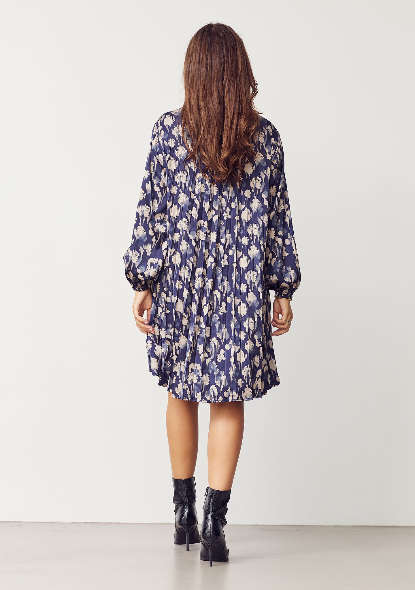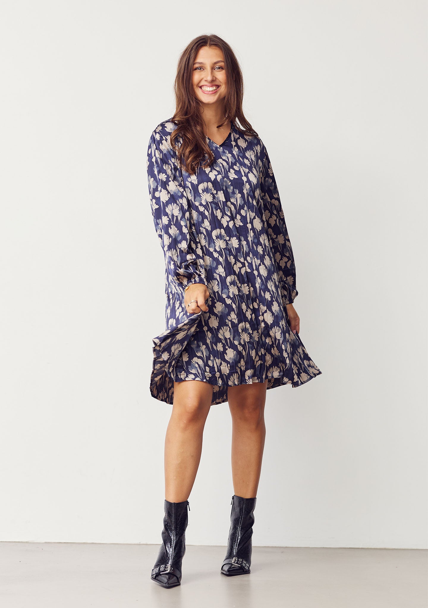 A beautiful and feminine dress with a pleated design and trendy print. The Bitten Pleat Dress features long sleeves with elastic cuffs, dropped shoulders, wide sleeves, and a V-neckline. The dress is made from a comfortable quality of 100% polyester and has a loose fit with a feminine A-line silhouette. The Bitten Pleat Dress is the perfect combination of style and comfort.