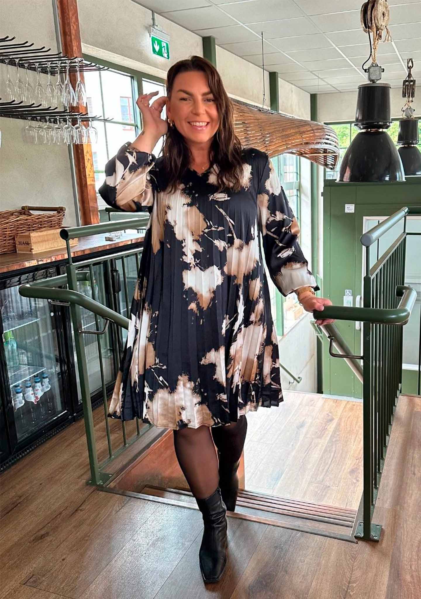 A beautiful and feminine dress with a pleated design and trendy print. The Bitten Pleat Dress features long sleeves with elastic cuffs, dropped shoulders, wide sleeves, and a V-neckline. The dress is made from a comfortable quality of 100% polyester and has a loose fit with a feminine A-line silhouette. The Bitten Pleat Dress is the perfect combination of style and comfort.