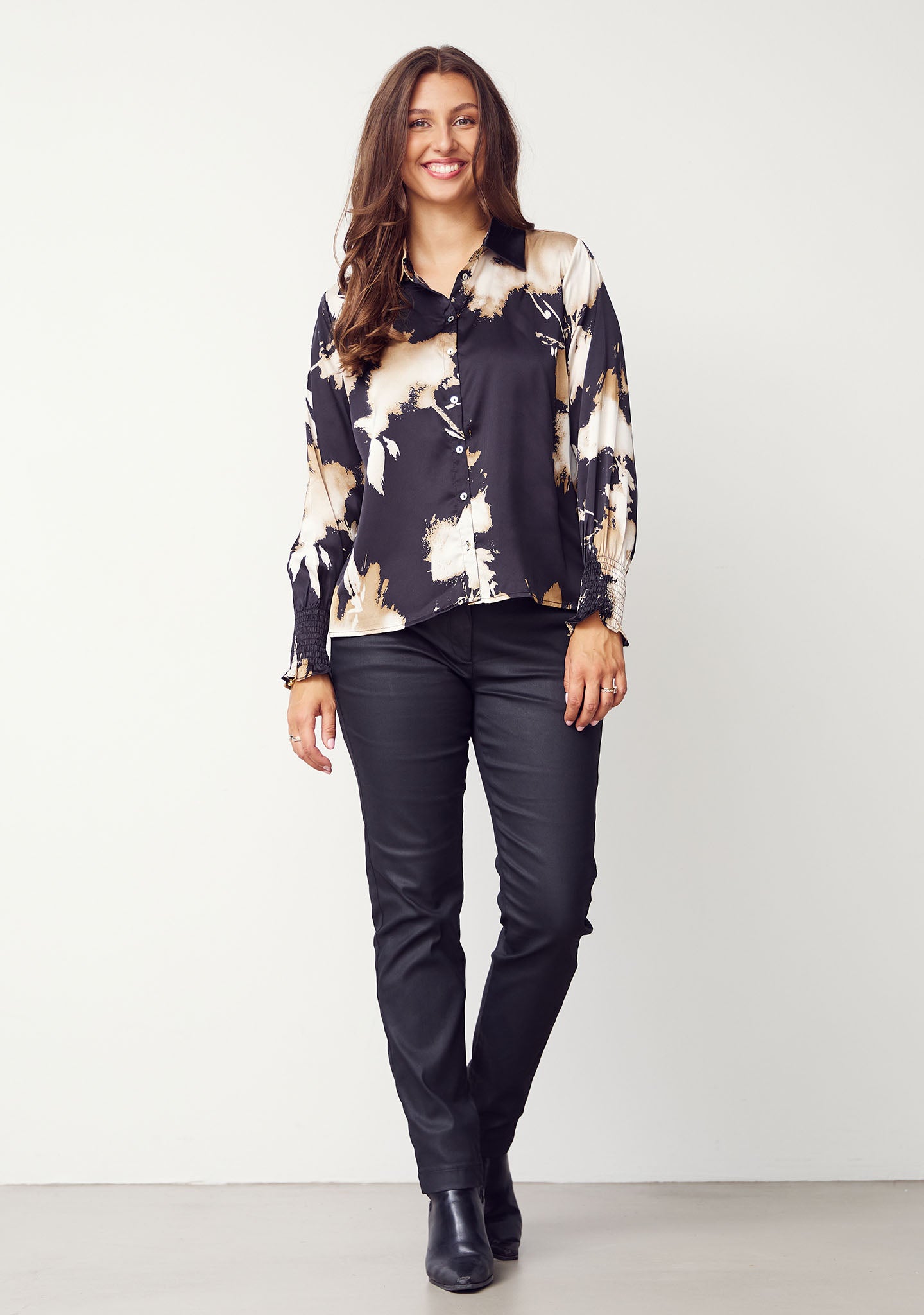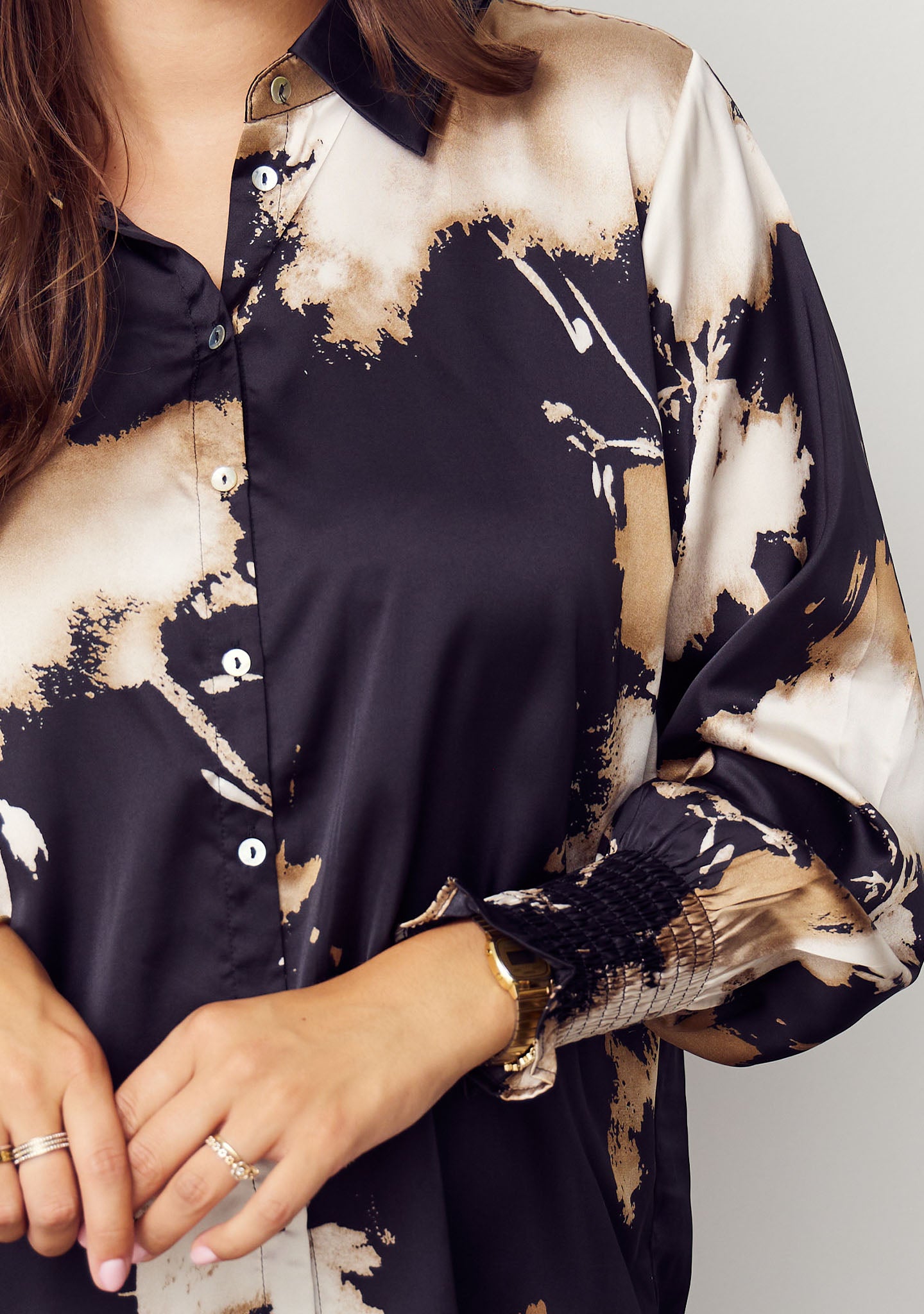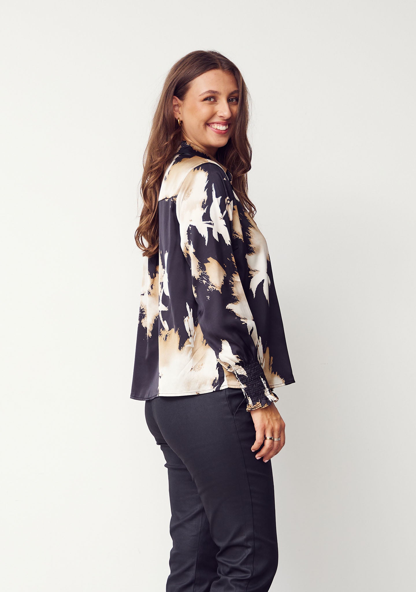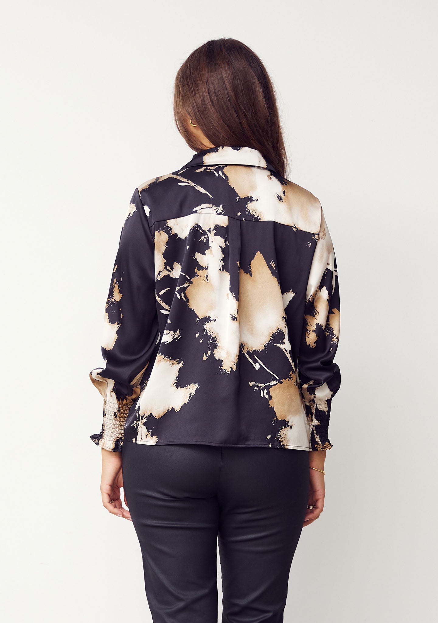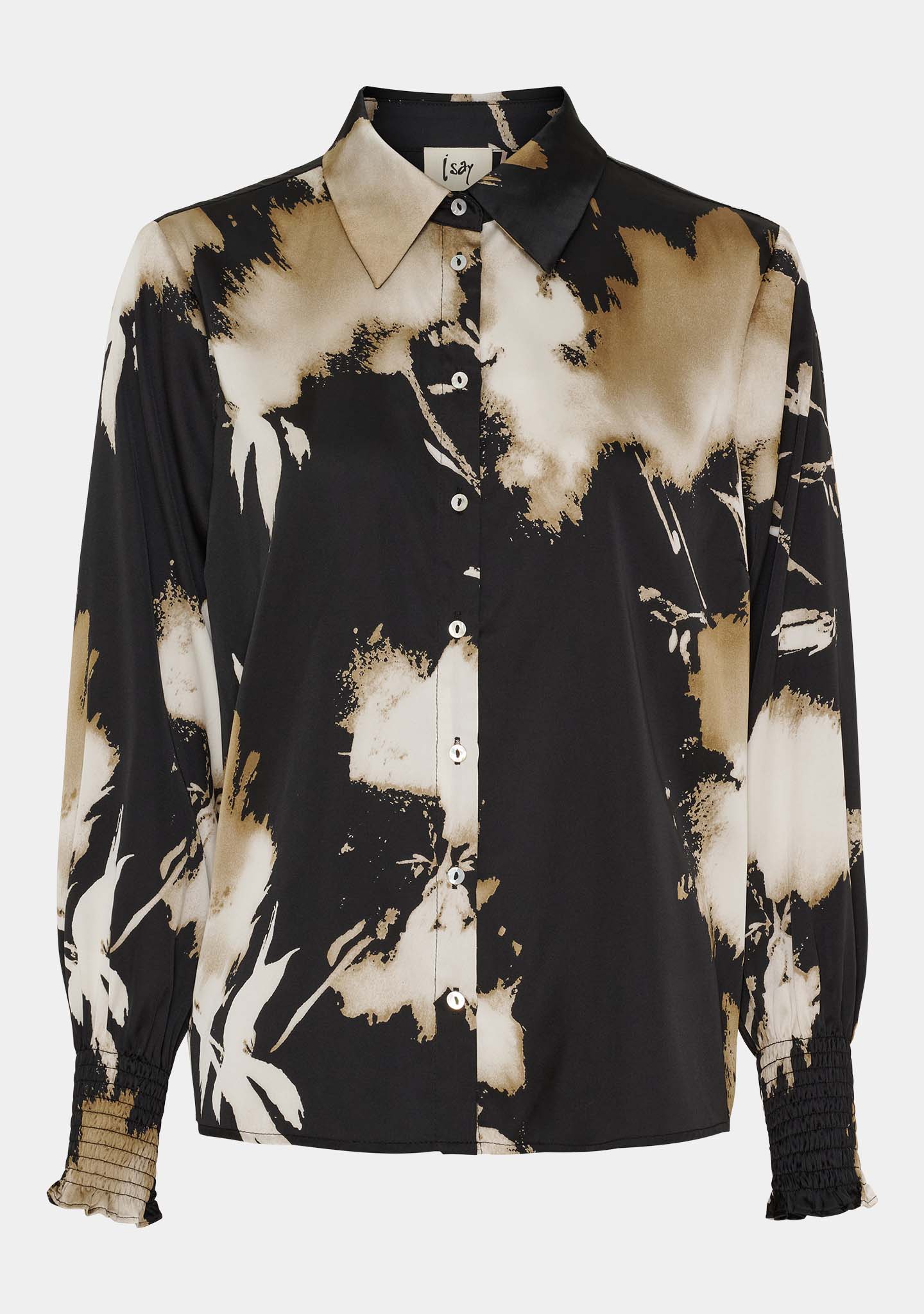 Melba Printed Blouse is the perfect shirt blouse with a cool and unique print that will add style to any wardrobe. The blouse features a button closure all the way down, allowing you to style it according to your own taste. Melba Printed Blouse has a classic collar, wide sleeves with elastic smocked cuffs, and an elegant satin look that adds a luxurious feel. With its satin look, this blouse is perfect for both everyday wear and festive occasions.