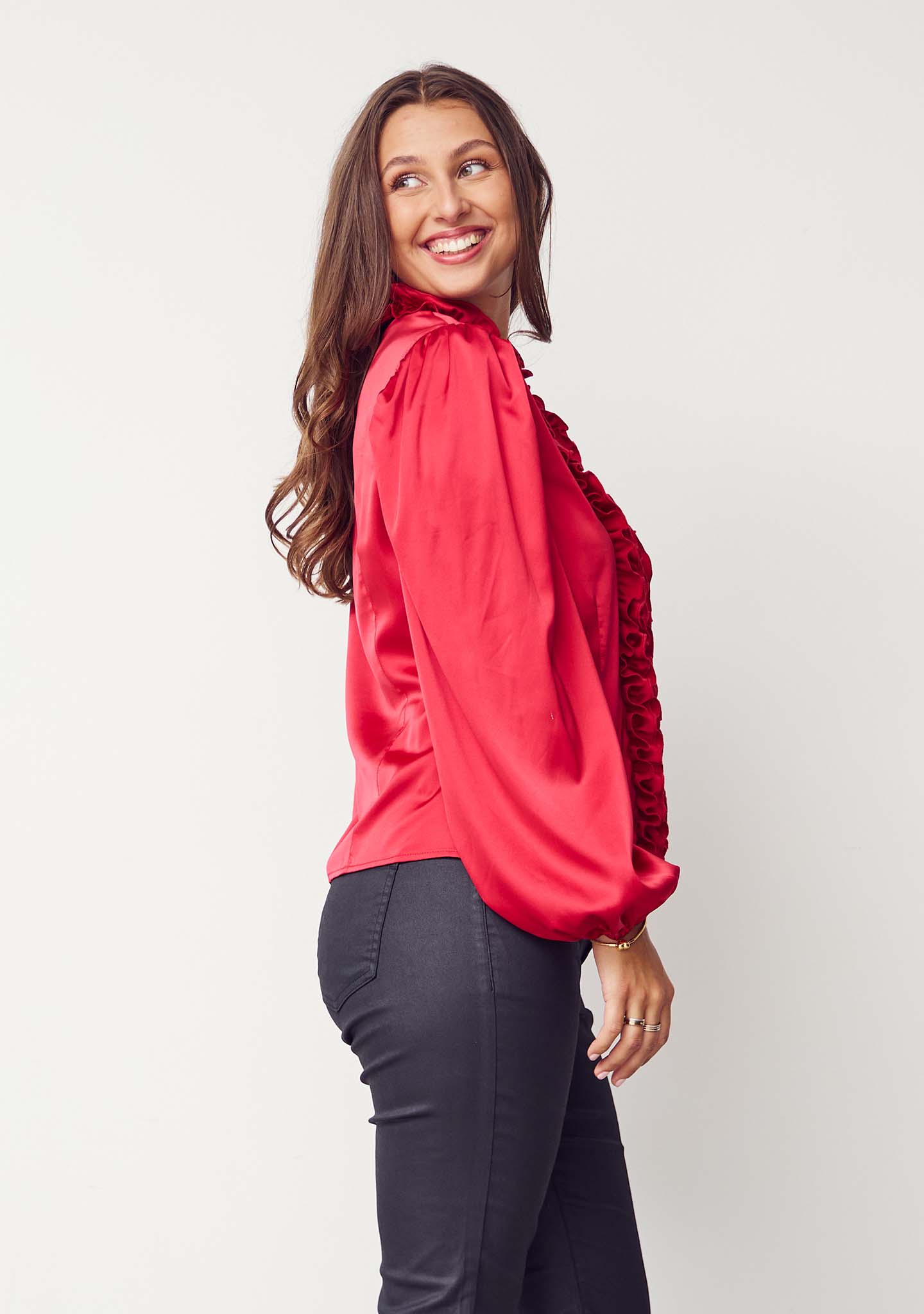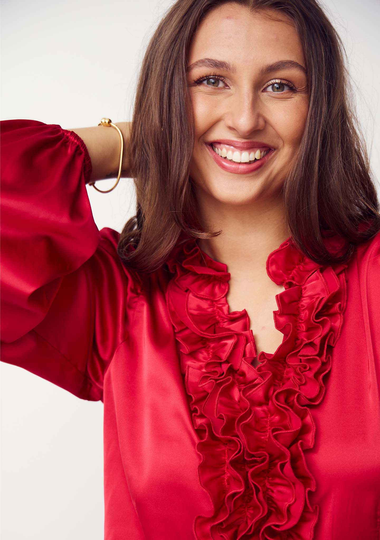 Maak een elegante indruk op uw volgende speciale gelegenheid met deze blouse met lange mouwen. De Steff Blouse is gemaakt van een zachte satijnkwaliteit van 97% polyester en 3% elastaan. Het kenmerkende van deze blouse zijn de volumineuze ruches aan de voorkant en bij de kraag, wat een uniek en opvallend detail toevoegt. Met zijn licht getailleerde pasvorm benadrukt het op een flatterende manier uw silhouet. Voor een complete stijl kunt u deze combineren met onze bijpassende Steff-onderdelen en een paar elegante hakken.