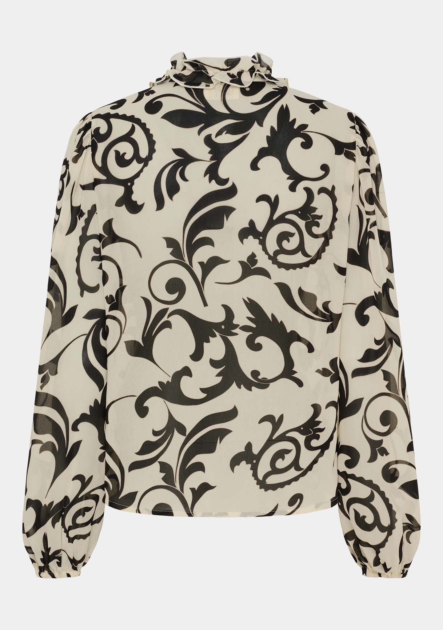 Vibse Ruffle Blouse - een absolute favoriet voor je garderobe dit seizoen. Deze blouse wordt gekenmerkt door zijn grafische print in mooie kleuren die meteen in het oog springen. Met een elegante V-hals versierd met fijne, volumineuze ruches en lange mouwen met elastiek, krijg je zowel stijl als comfort in één. Vibse Ruffle Blouse is licht doorschijnend en heeft een normale pasvorm, dus we raden aan om een top onder de blouse te dragen voor extra dekking. Deze blouse is niet alleen mooi, maar ook zeer comfortabel en gemakkelijk te dragen.