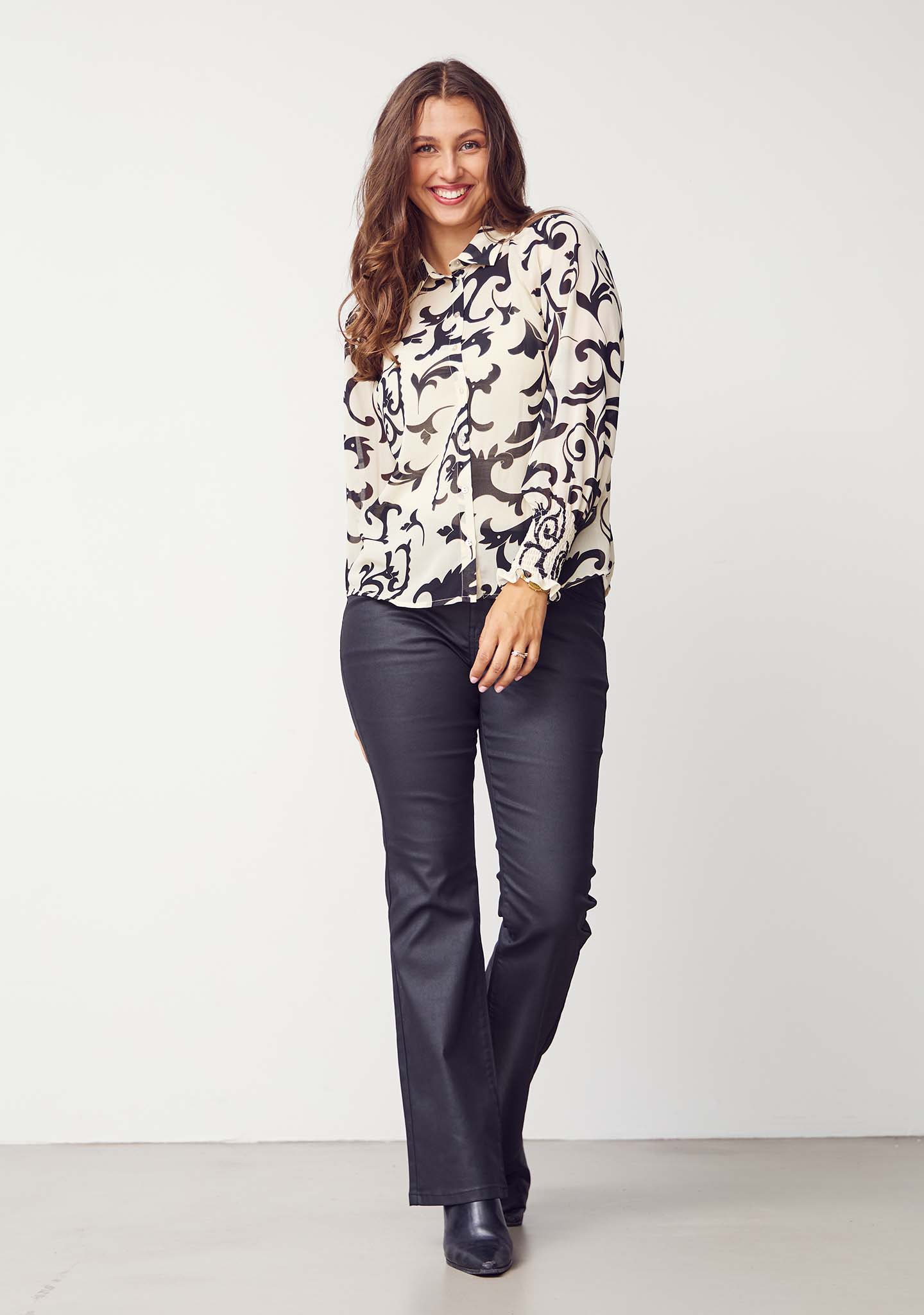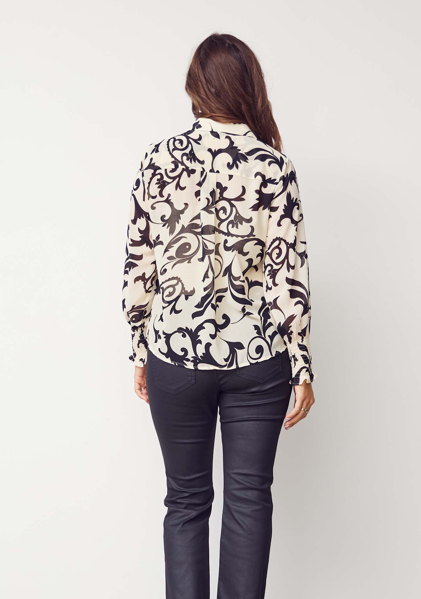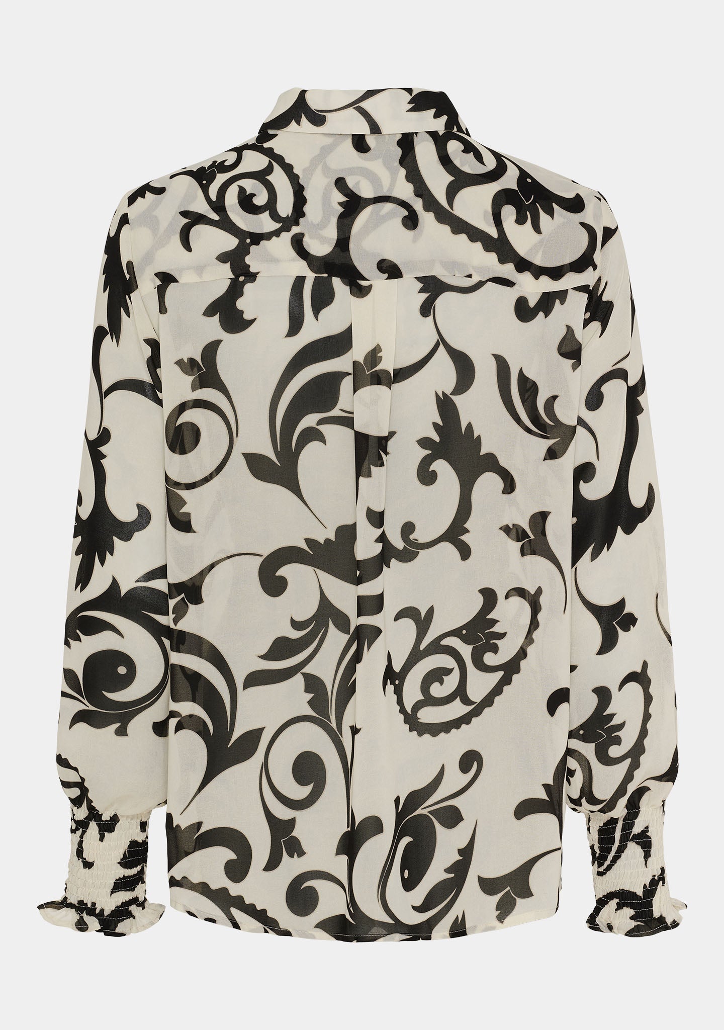 Our elegant Vibse shirt is versatile and can be styled in many ways. This shirt is transparent in its material and has a lovely loose and spacious fit. It features a classic button closure with buttons all the way down and a pointed collar. Vibse shirt has a flattering print and the finest smock details at the sleeve openings, adding a feminine touch. It can be stylishly paired with a pair of pants or a smart skirt, preferably with a pair of classic loafers for a perfectly elegant look.