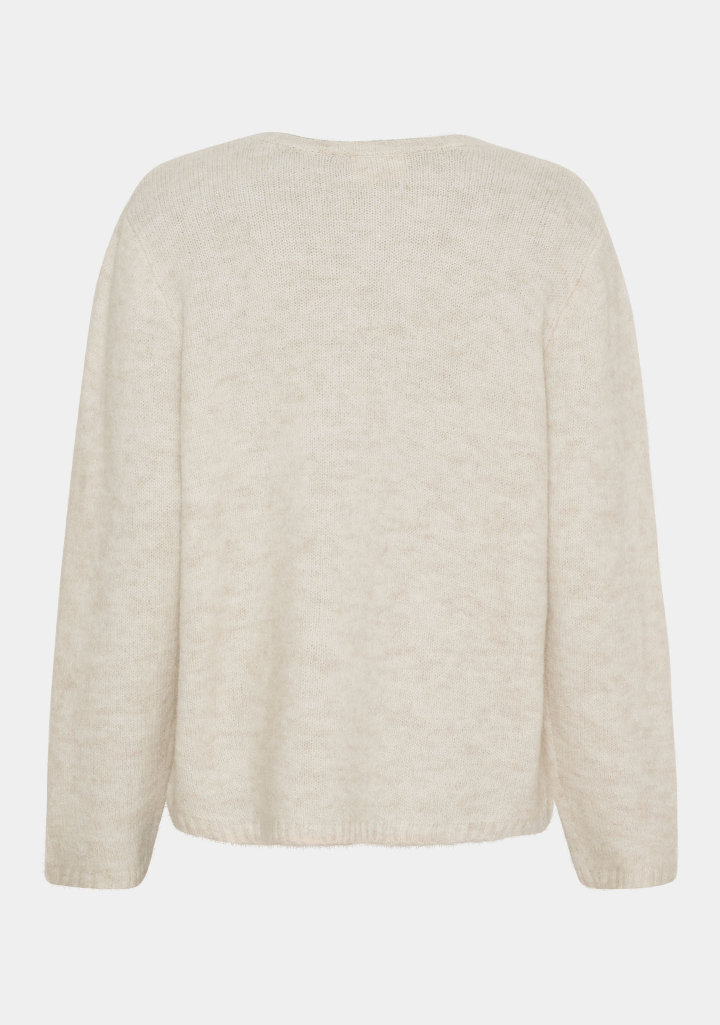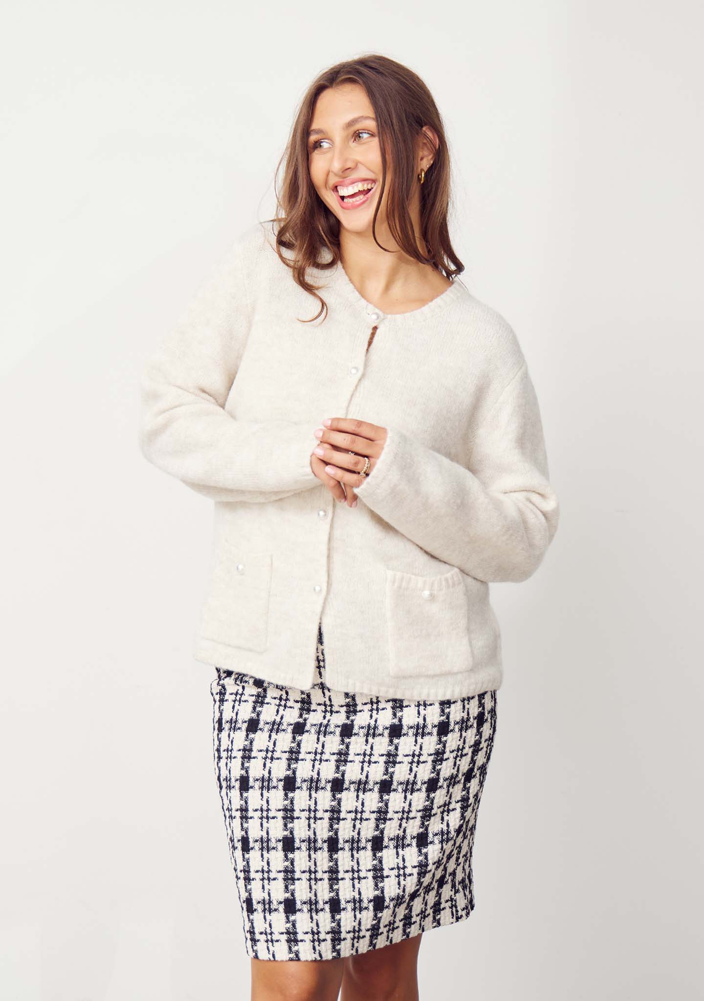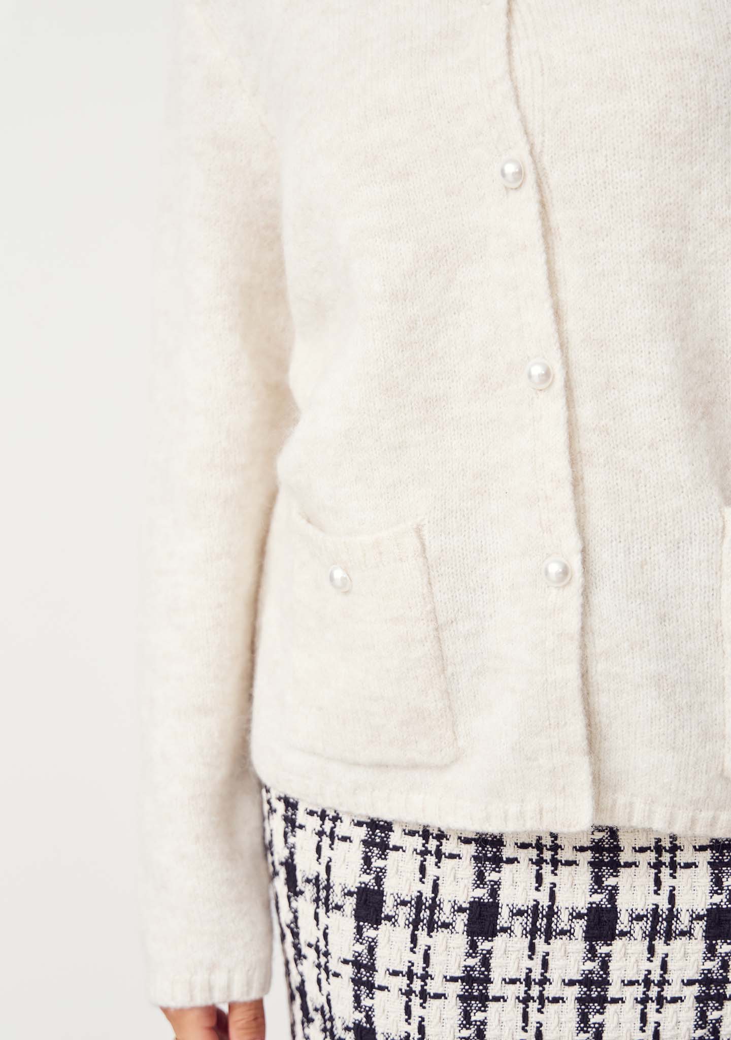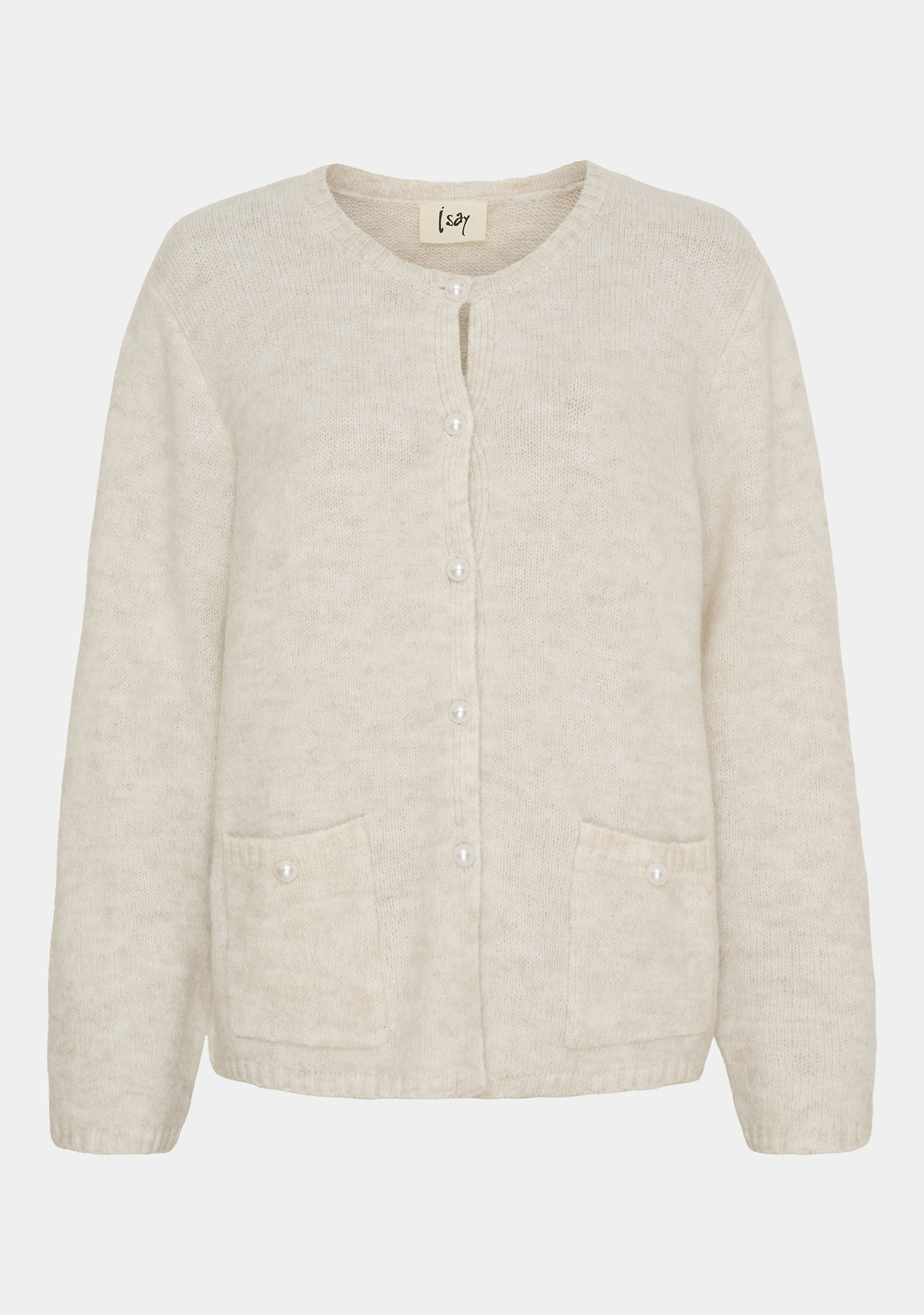 De cardigan heeft een ronde hals en volledige knopen aan de voorkant, wat hem een eenvoudige en elegante uitstraling geeft. De voorzakken voegen een praktisch en gezellig detail toe.