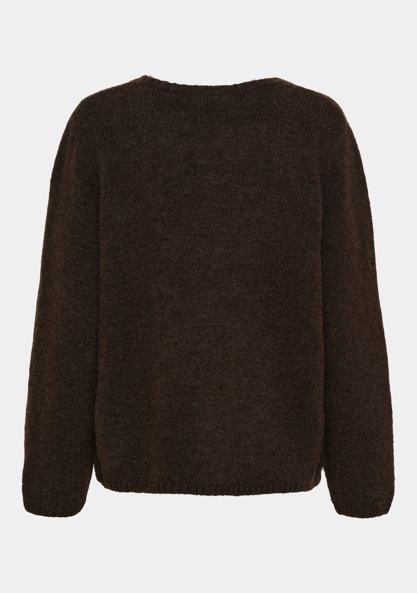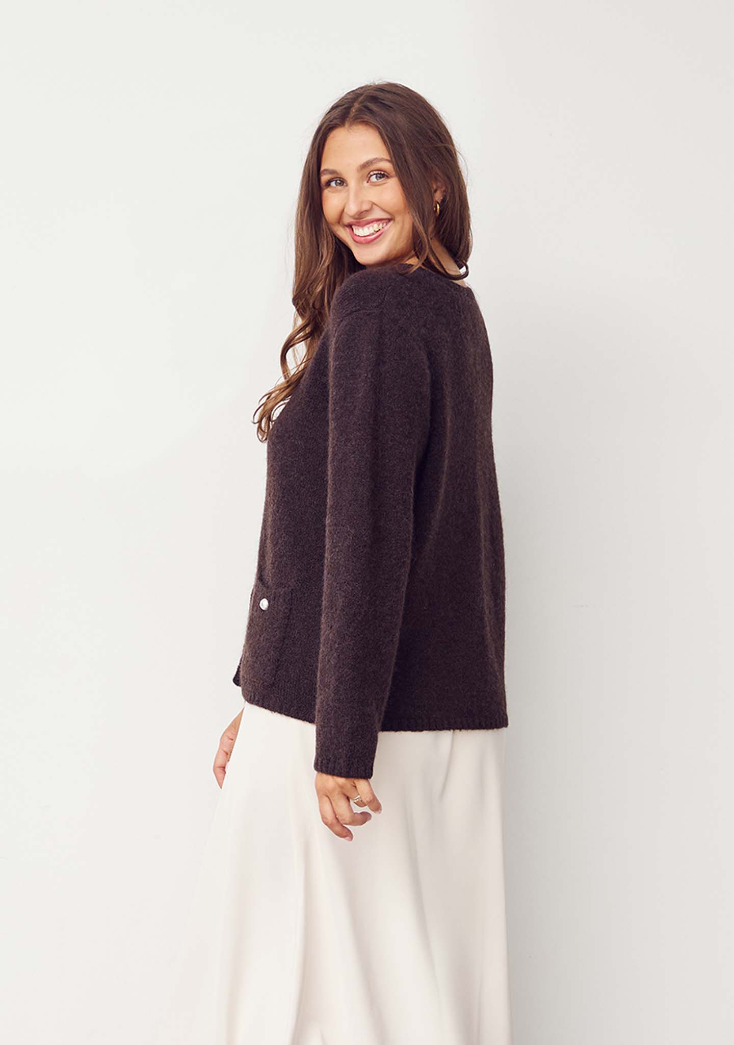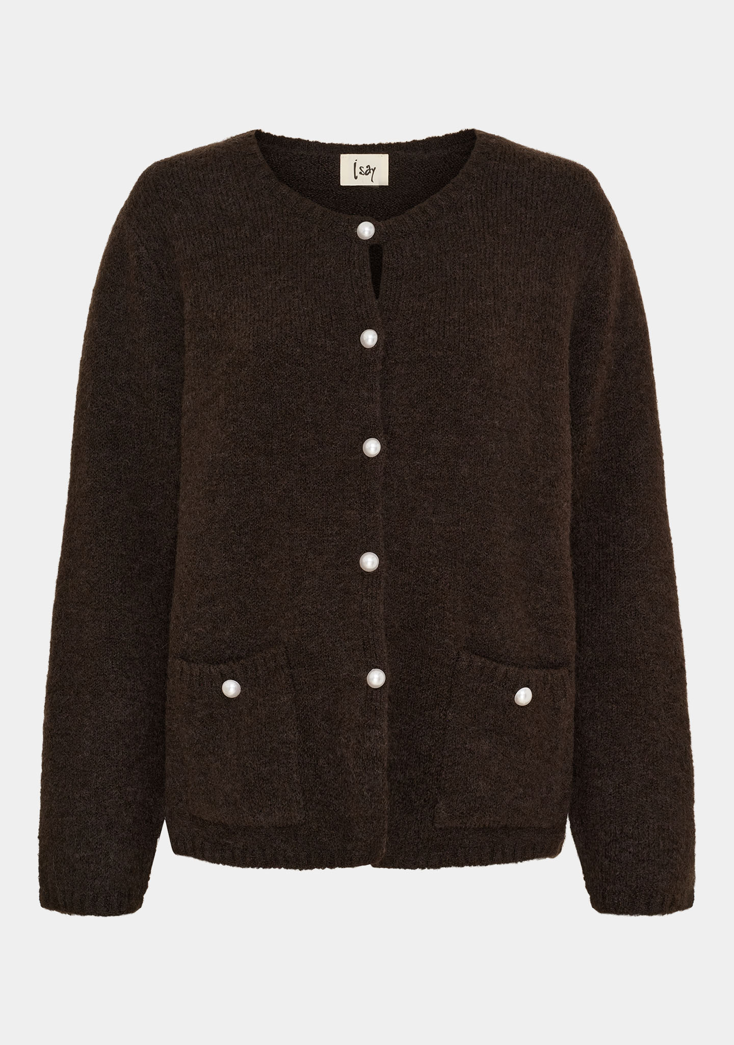 De cardigan heeft een ronde hals en volledige knopen aan de voorkant, wat hem een eenvoudige en elegante uitstraling geeft. De voorzakken voegen een praktisch en gezellig detail toe.