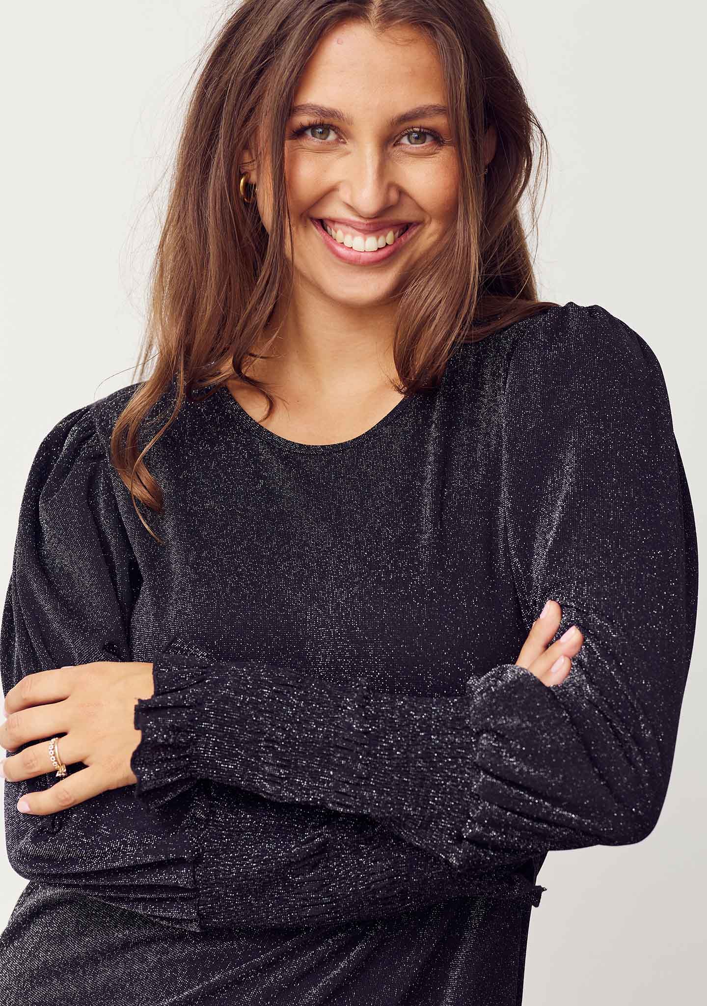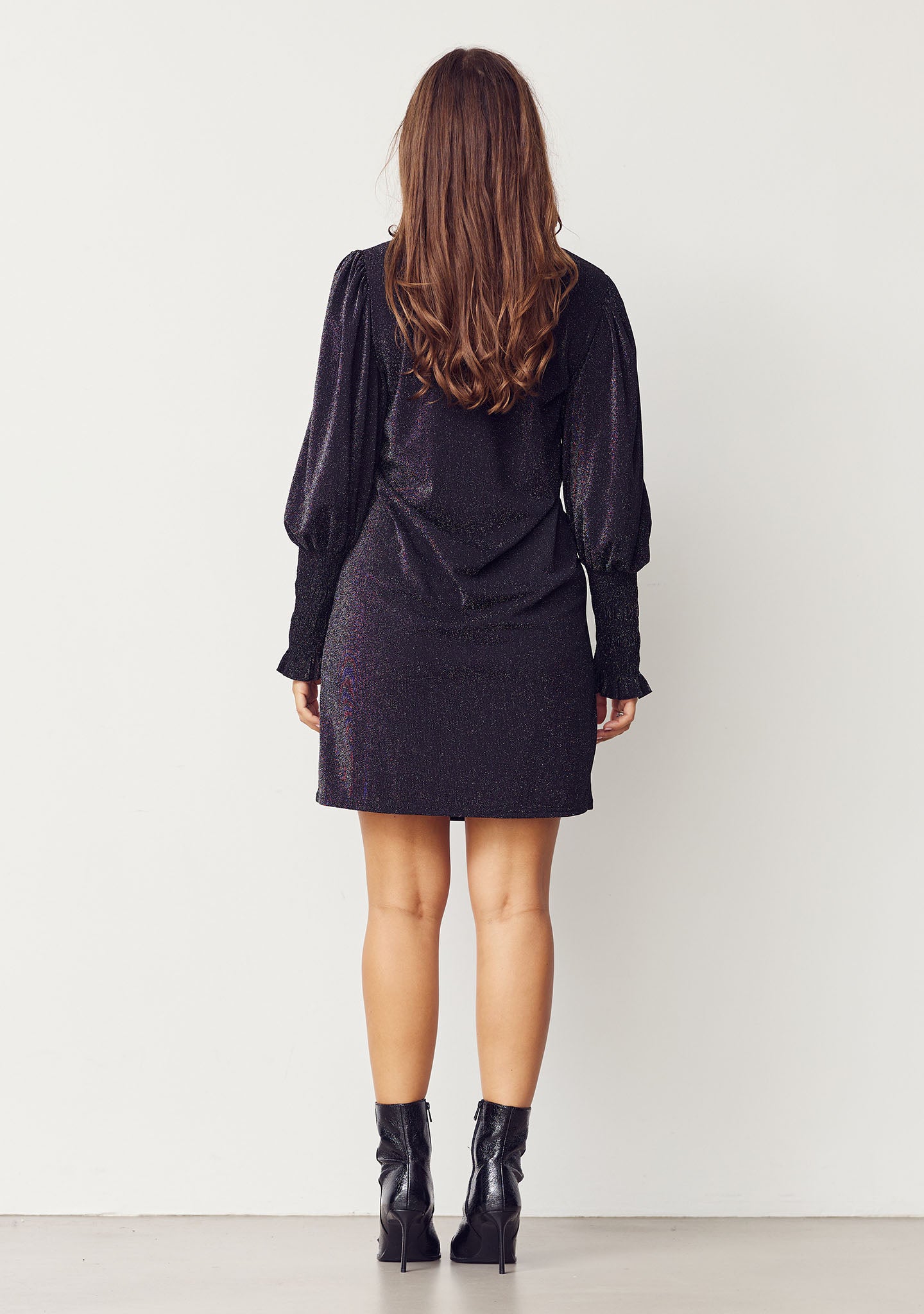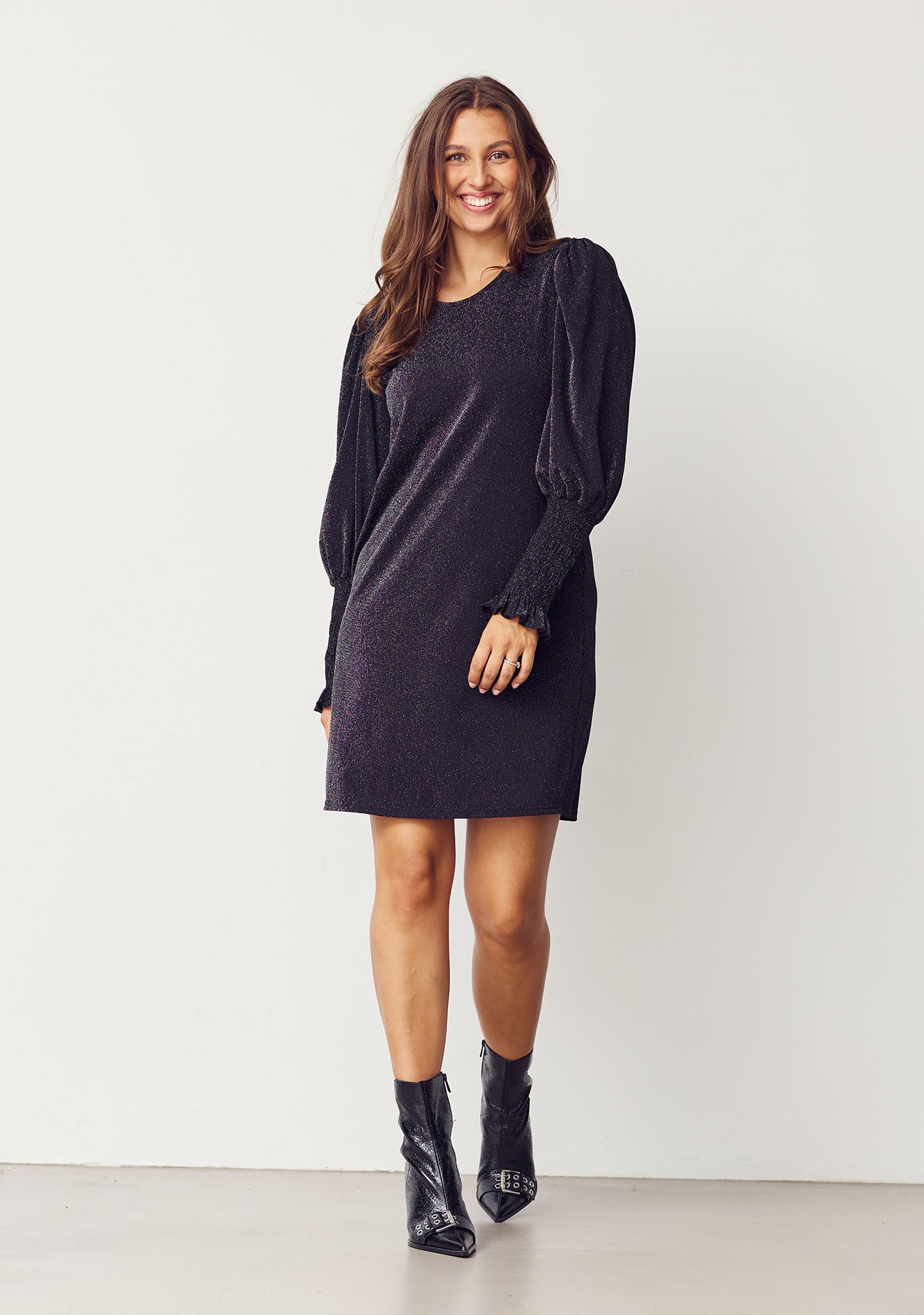 De jurk heeft een ronde hals, een licht A-lijn snit en lange ballonmouwen met smock en een kleine volant rand, die een vrouwelijk tintje toevoegen. De pasvorm is comfortabel en ruim genoeg om vrij te kunnen bewegen - of je nu danst, werkt, of je gewoon de hele avond comfortabel wilt voelen.