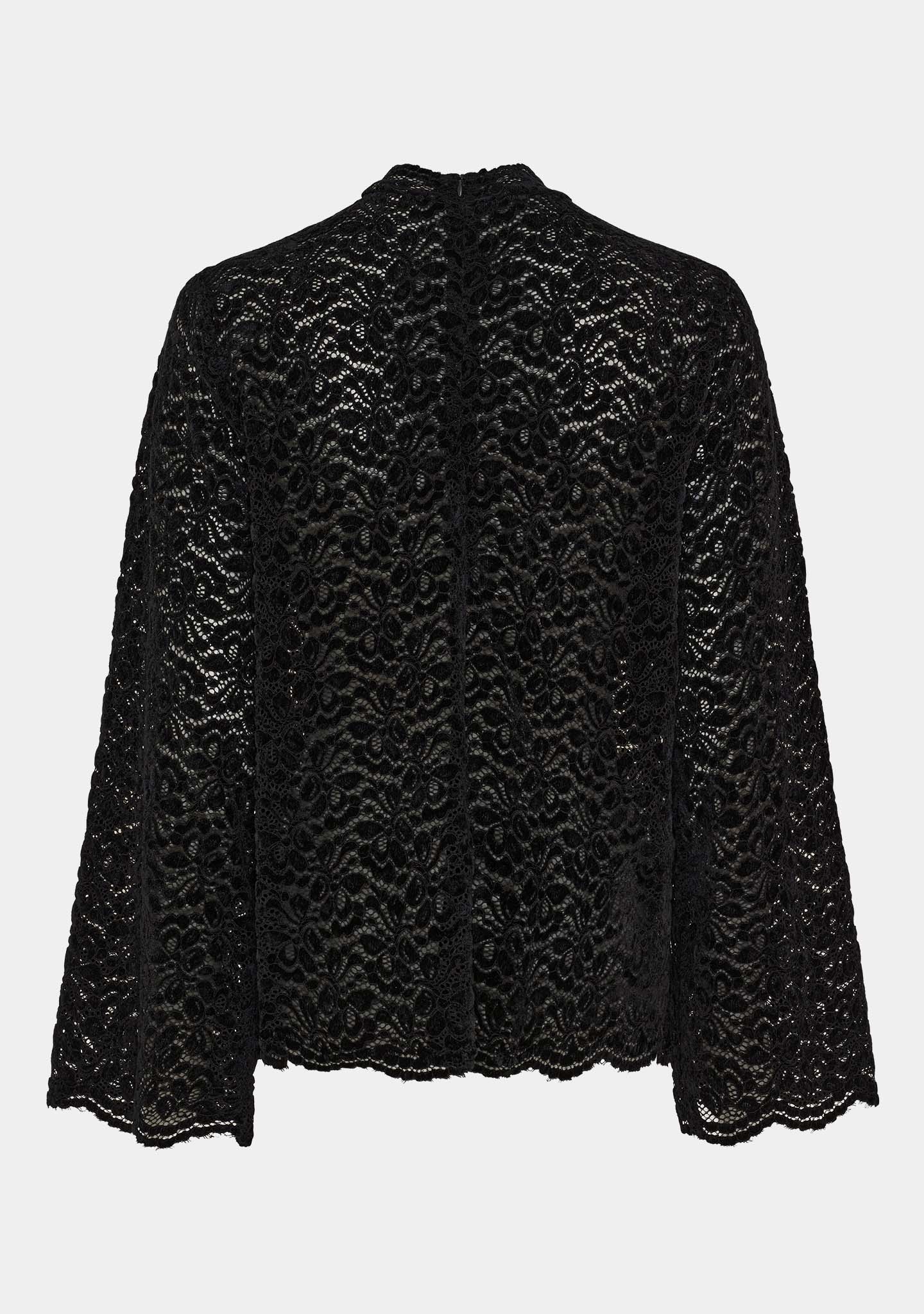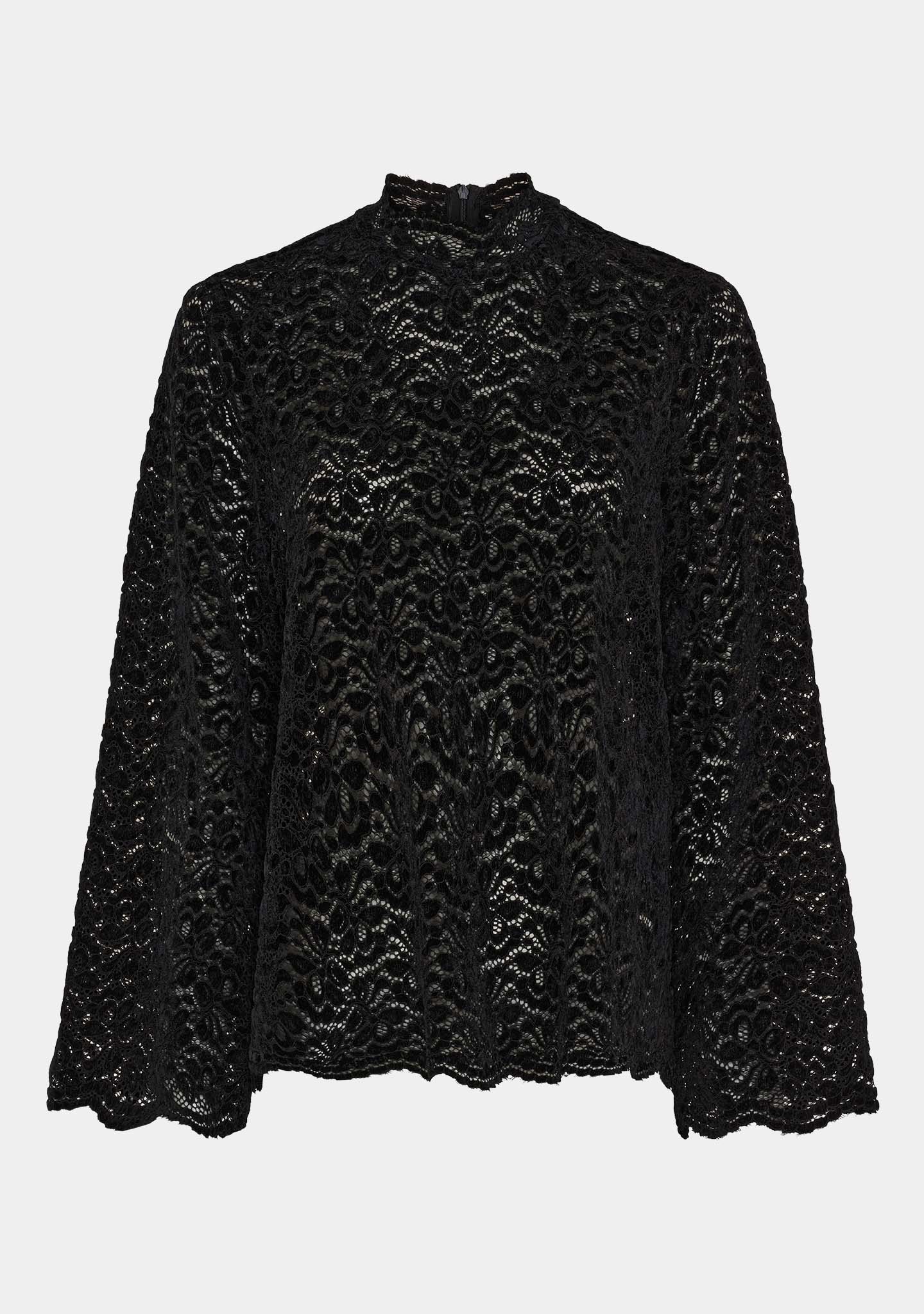Kamille Kant Blouse is een mooie en vrouwelijke kanten blouse met een exclusieve uitstraling. De hoge hals en lange mouwen met een golvende rand creëren een stijlvol ontwerp dat het elegante uiterlijk van de blouse benadrukt.