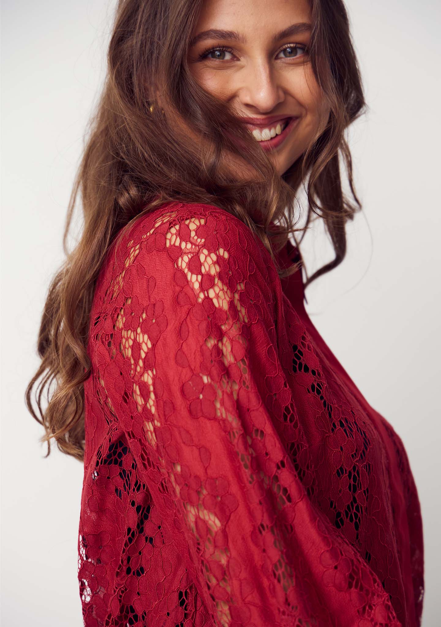 De lange mouwen zijn afgewerkt met manchetten die zorgen voor een verzorgde uitstraling. De lichte katoen en polyamide mix voelt comfortabel aan op de huid en zorgt voor een luchtig gevoel. Draag Kimie Lace Shirt met een top eronder voor een meer bedekte uitstraling of met een hoge taille broek voor een stijlvol contrast.