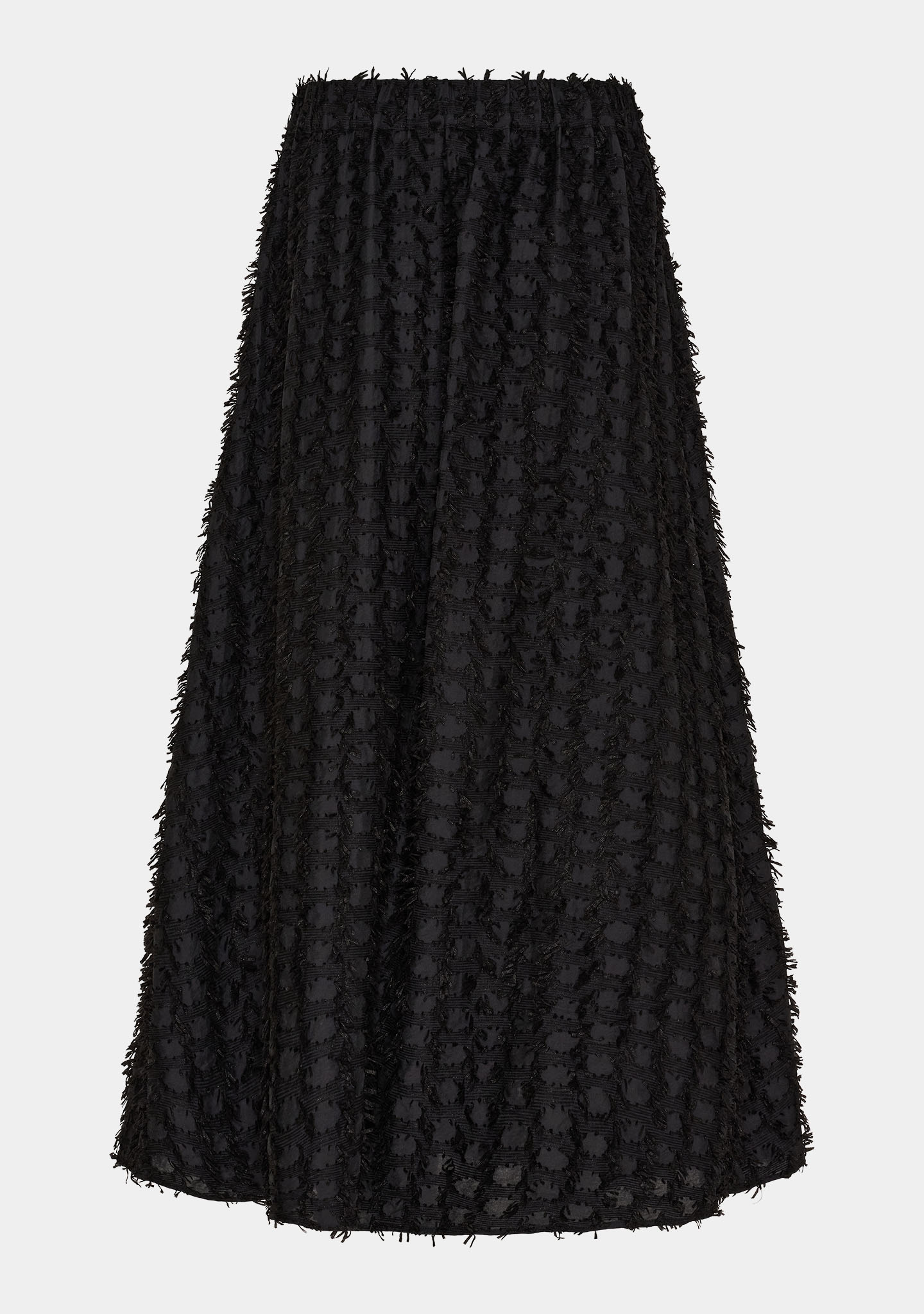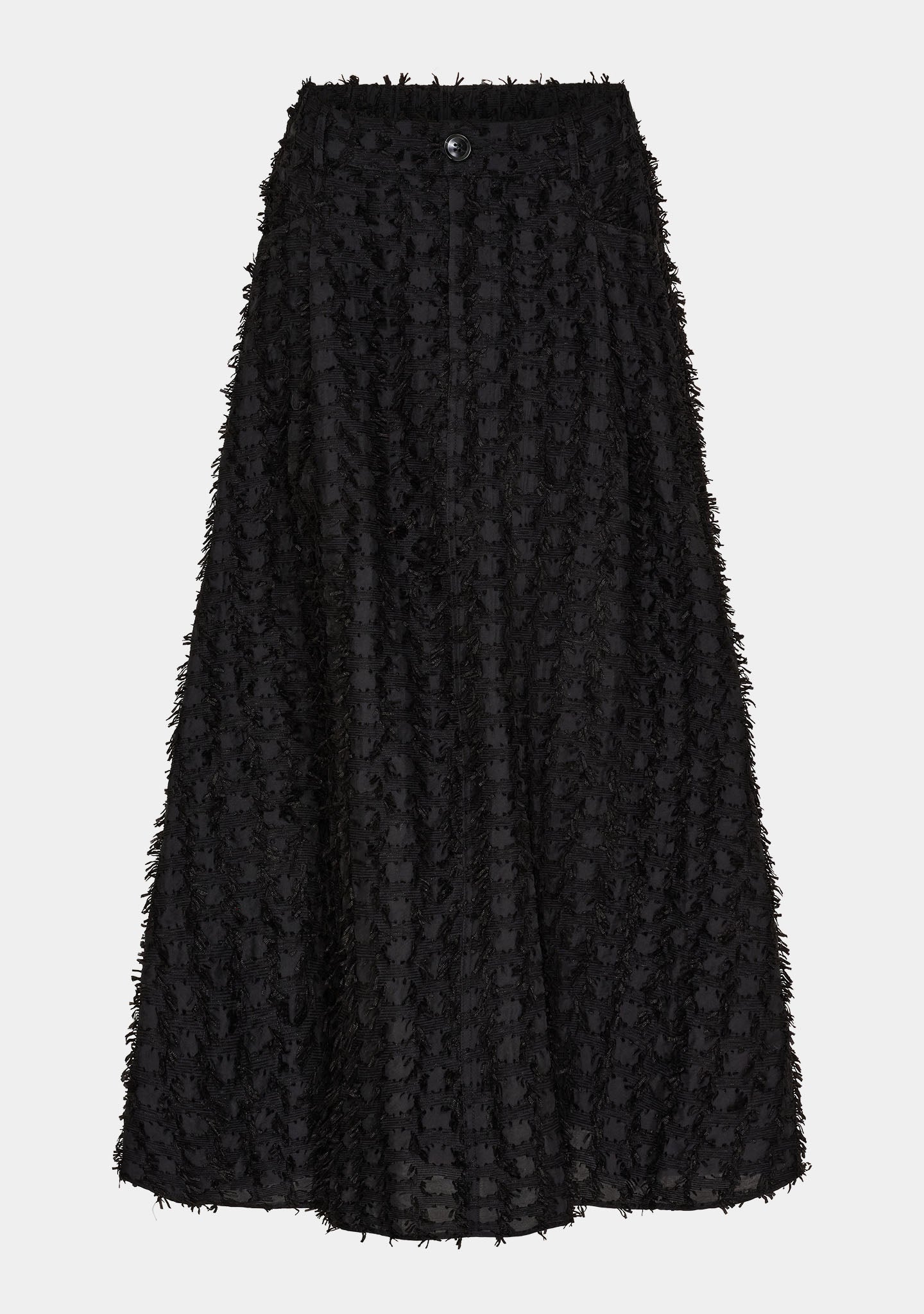 Deze elegante A-lijn midi-rok combineert klassiek design met unieke details. Hij is gemaakt van een stof met een decoratief franje-effect dat een exclusieve en levendige uitstraling geeft. De rok heeft een vaste tailleband met riemlussen zodat je jouw favoriete riem kunt toevoegen en sluit met een knoop en rits aan de voorkant. Aan de voorkant vind je praktische zakken met fijne plooien die een vrouwelijke touch toevoegen en de rok zowel stijlvol als functioneel maken. Perfect om te combineren met een lichte blouse voor dagelijks gebruik of een gebreid item voor koelere dagen.