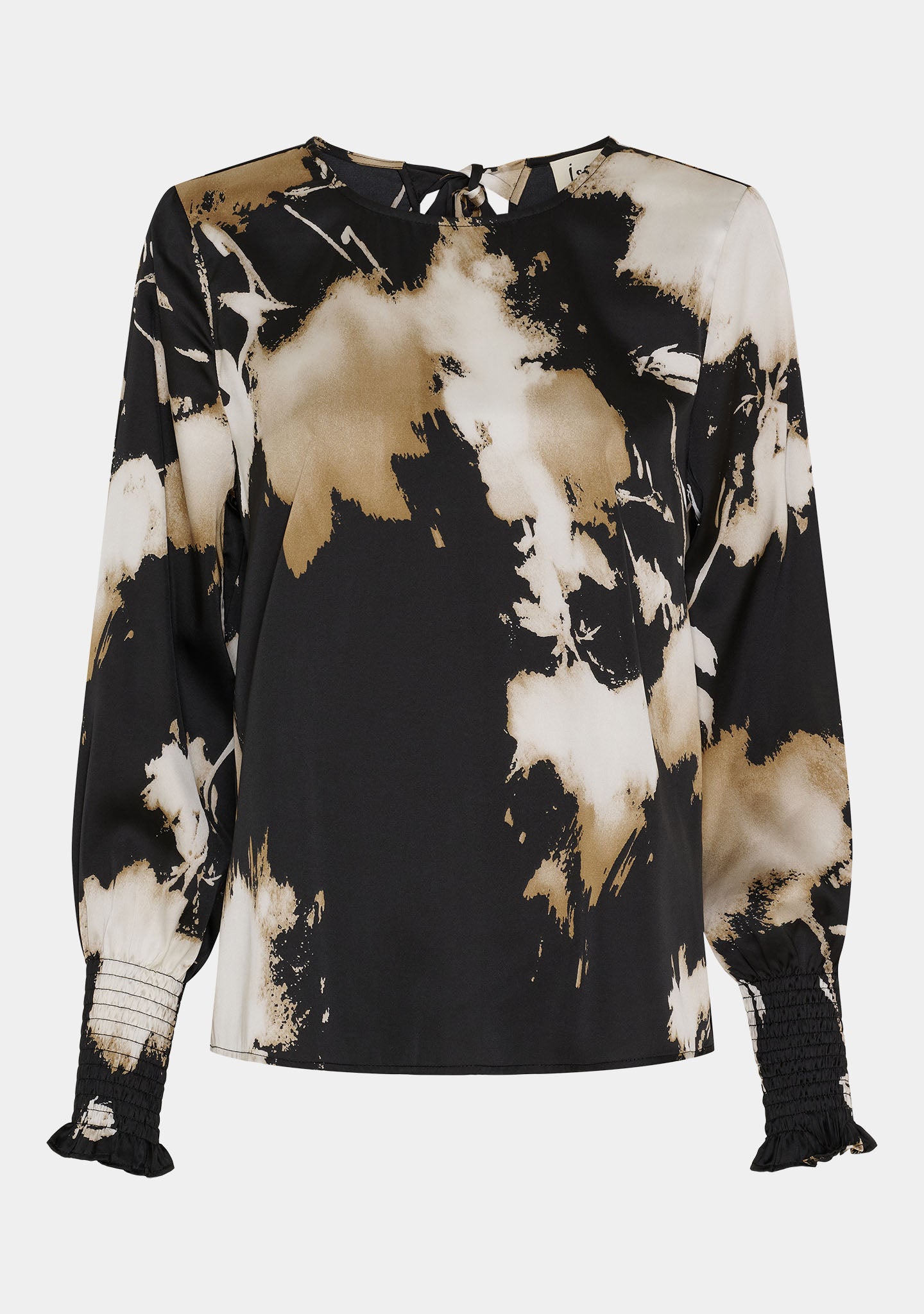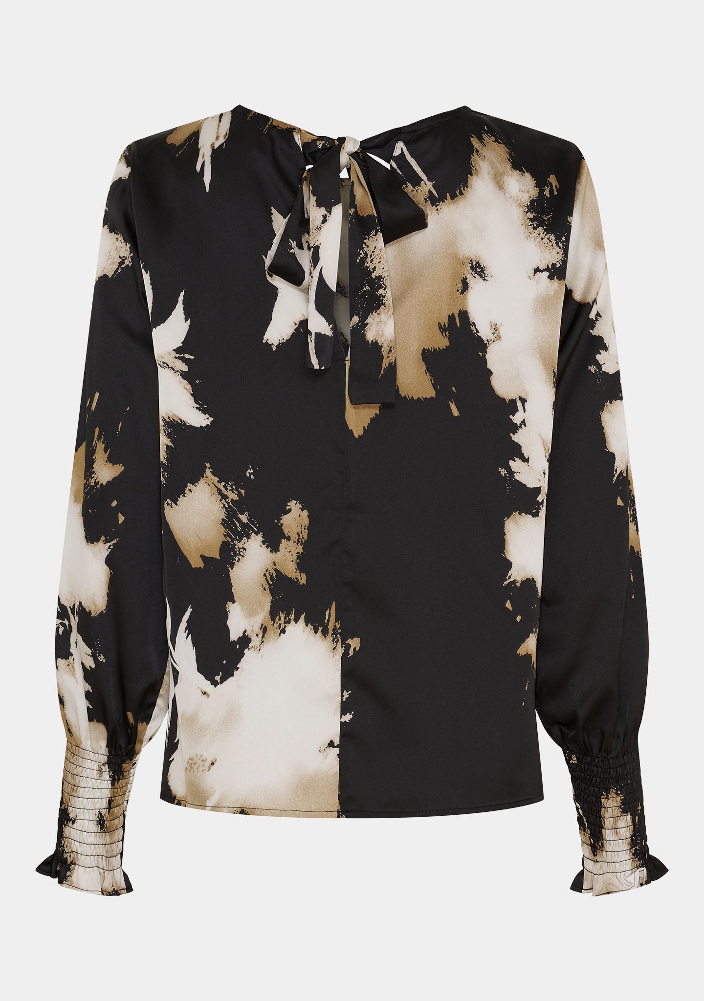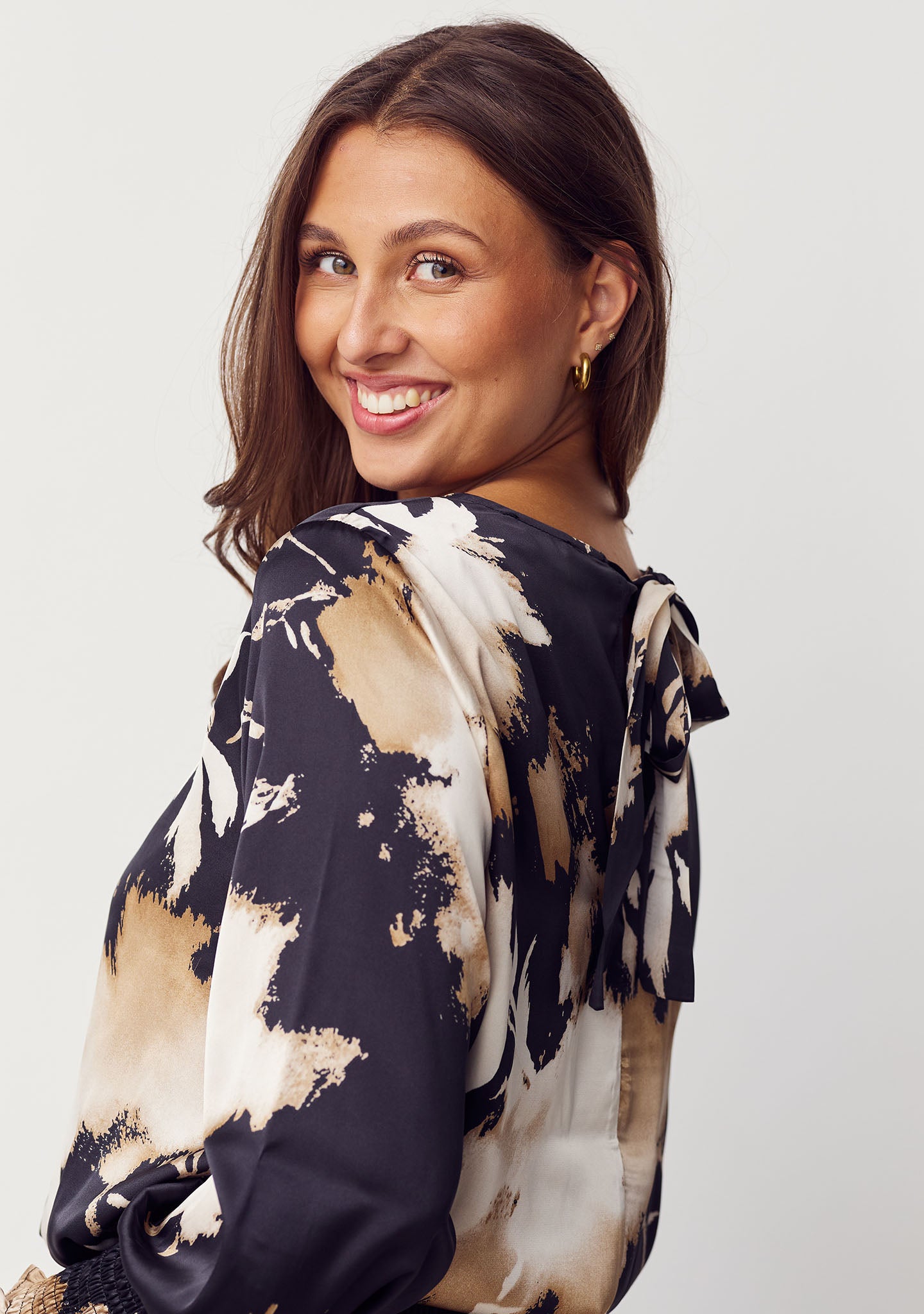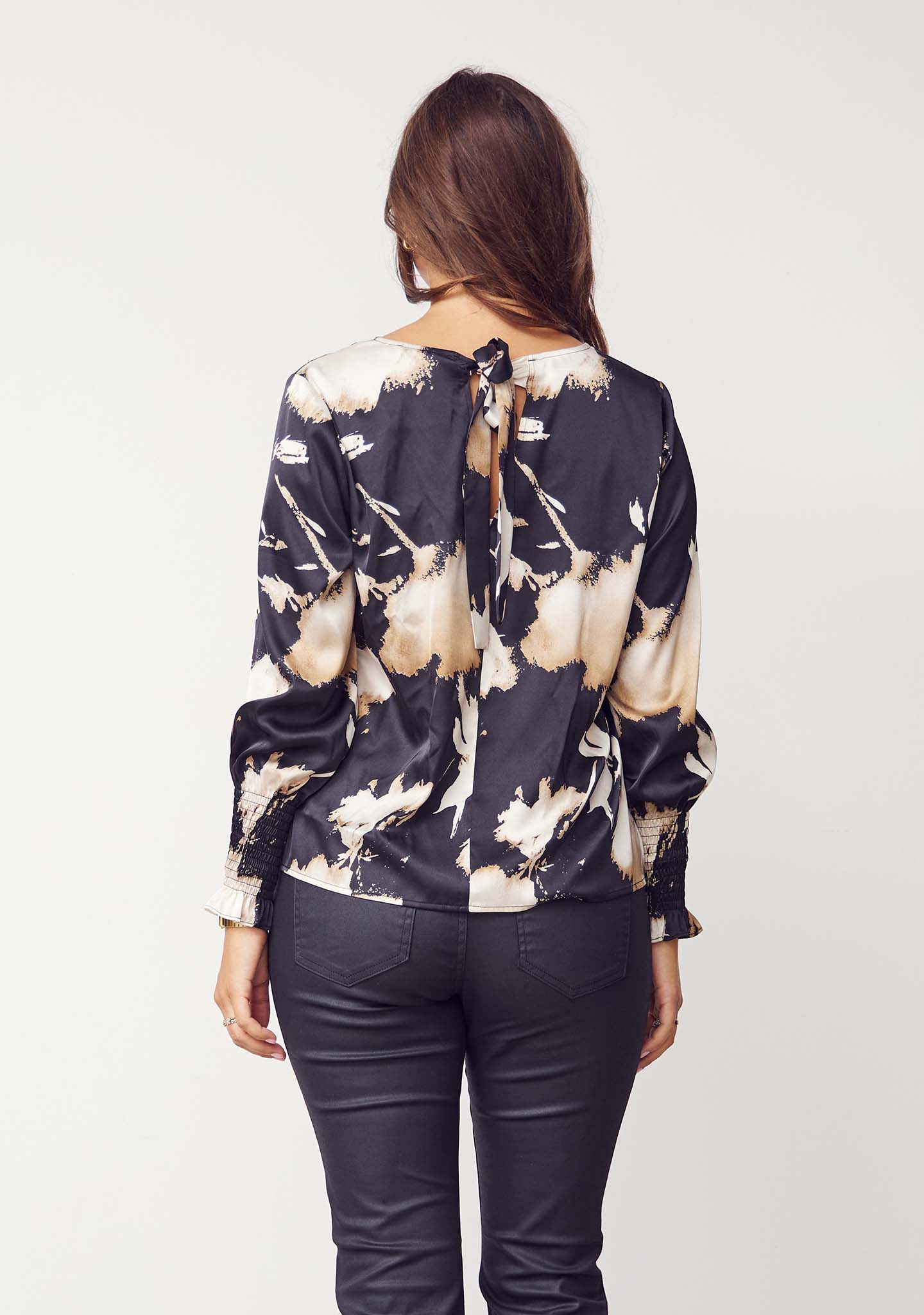 Aan de achterkant heeft de Kleo Blouse een vastgestrikt lint in de nek dat je kunt strikken of losjes kunt laten hangen - afhankelijk van je stijl. De kwaliteit is geweven polyester met een lichte glans en een mooie val.