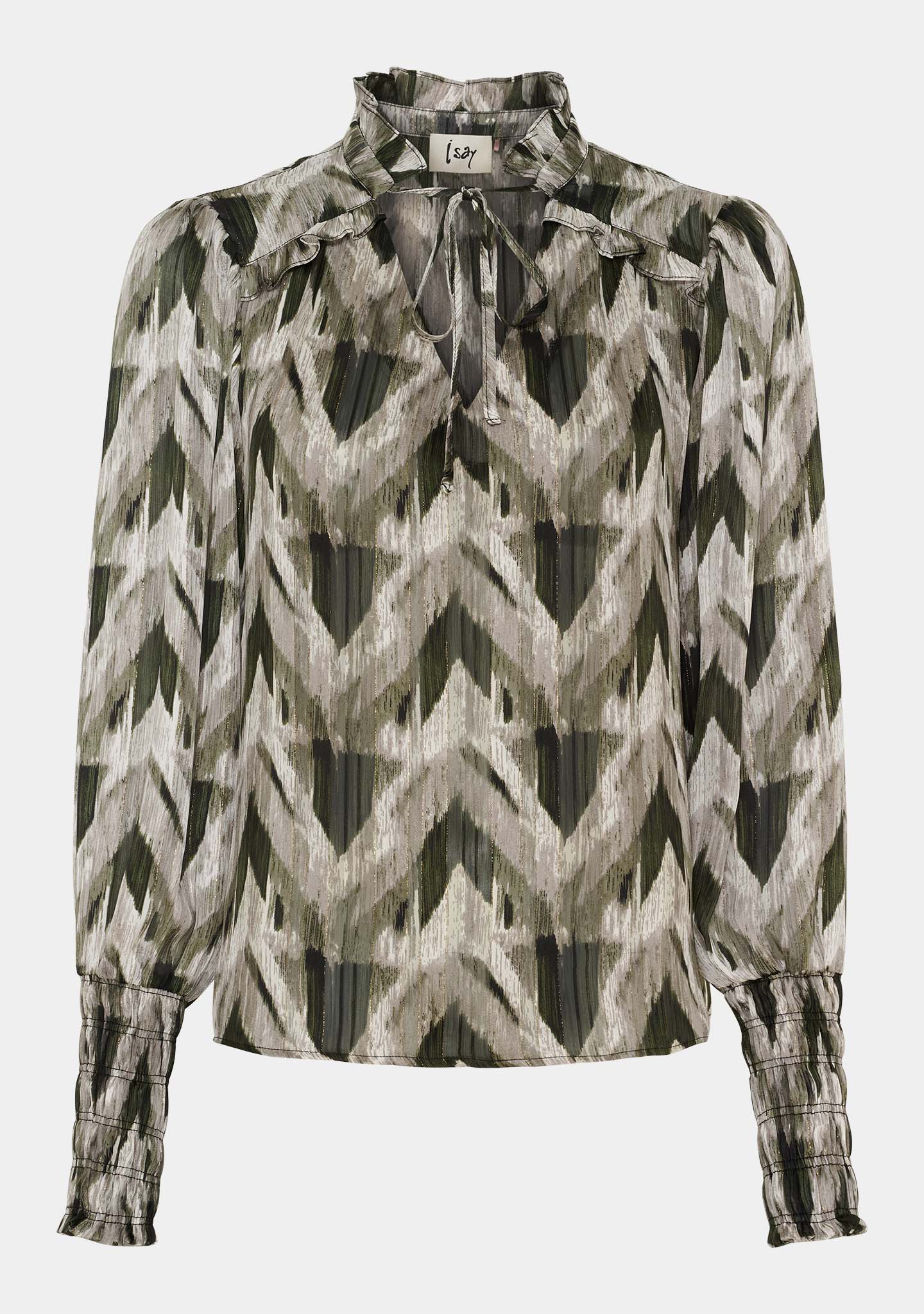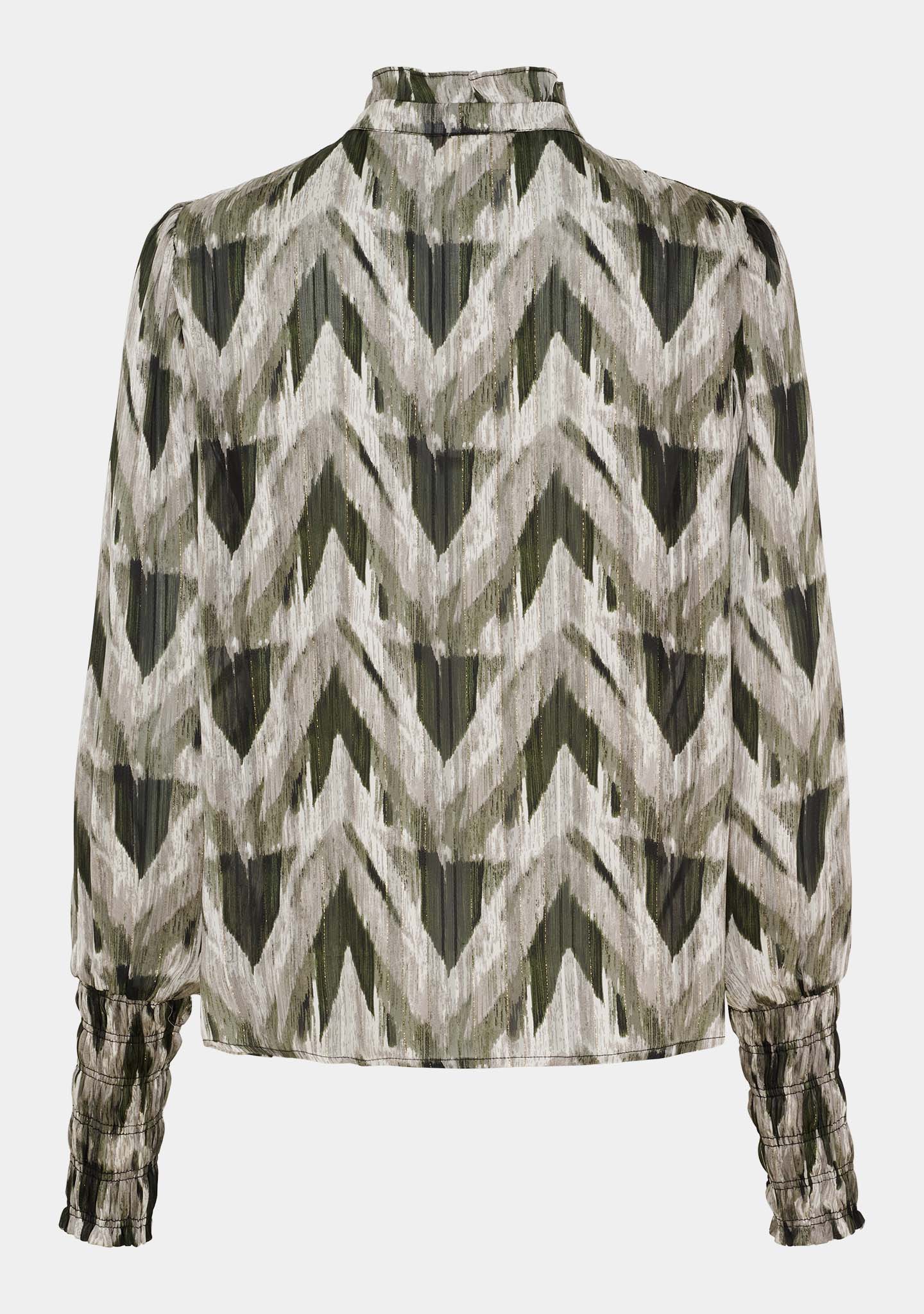 De Kuna Blouse is een stijlvolle en lichte blouse met een moderne uitstraling. De kleine opstaande kraag met strikband voegt een subtiel, verfijnd tintje toe, terwijl de lange mouwen met brede manchetten een mooi silhouet creëren.