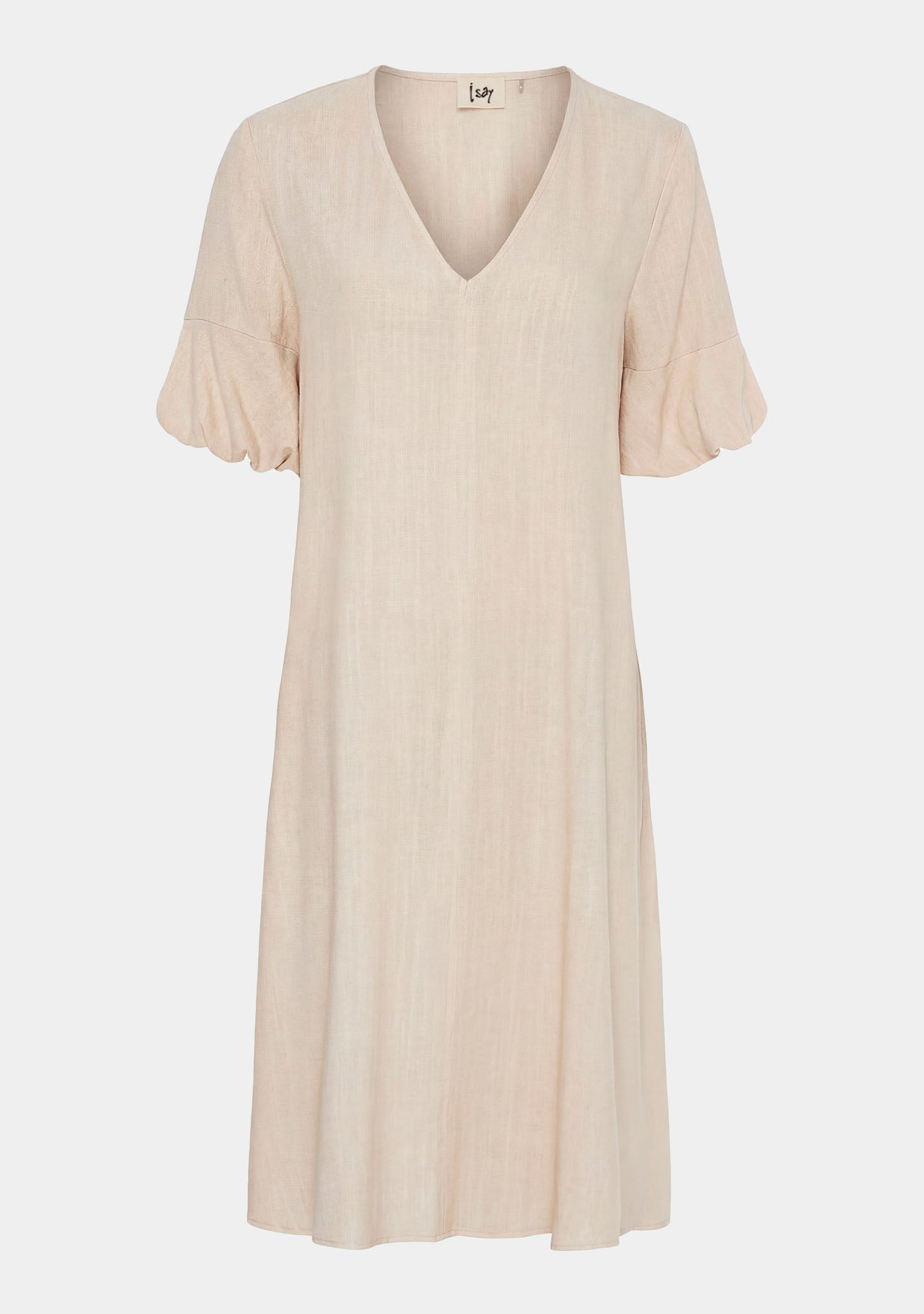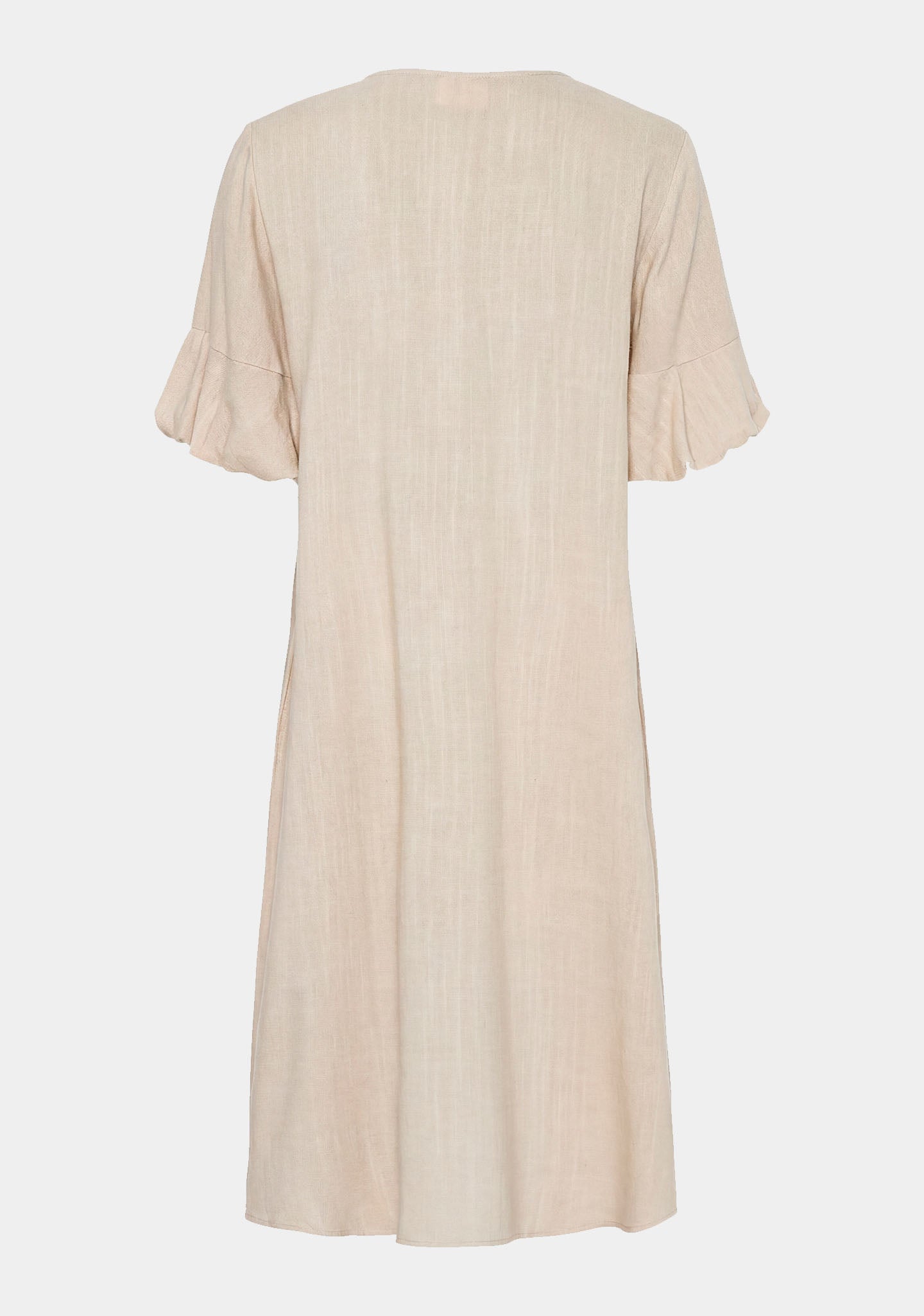 De ballonmouwen geven de jurk karakter. Ze hebben een zachte volume en stoppen rond de elleboog, waardoor een fijne balans ontstaat tussen het casual en het meer elegante. Het is het detail dat maakt dat de jurk doordacht aanvoelt - zonder te veel te zijn.