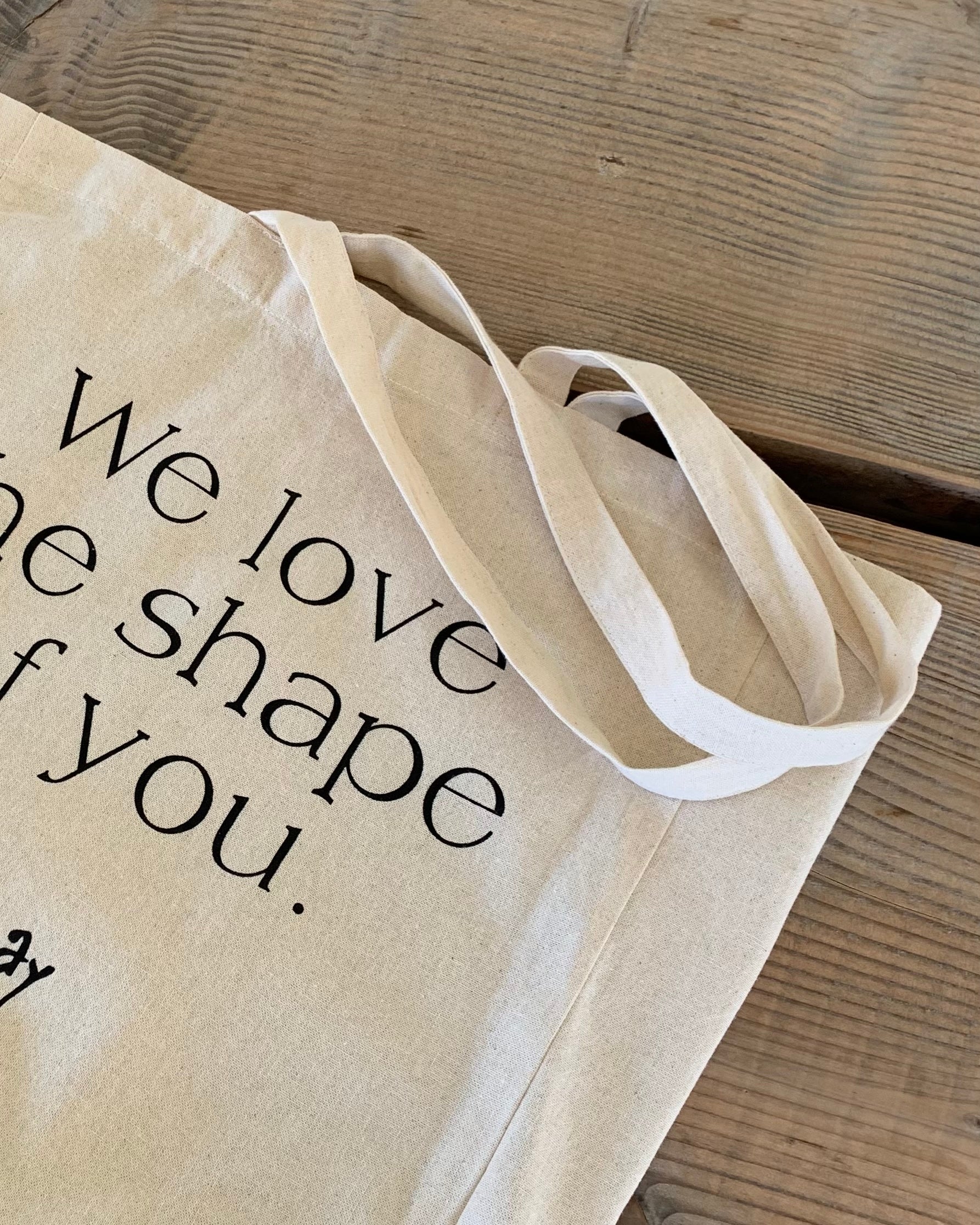 Laat je stijl en boodschap zien met onze ruime en duurzame tote bag van 100% biologisch katoen. De tas heeft een eenvoudig en elegant ontwerp met de tekst "We love the shape of you." op de voorkant gedrukt – een boodschap die diversiteit en eigenliefde viert. Perfect voor dagelijkse bezigheden, winkelen of als extra tas voor onderweg.
